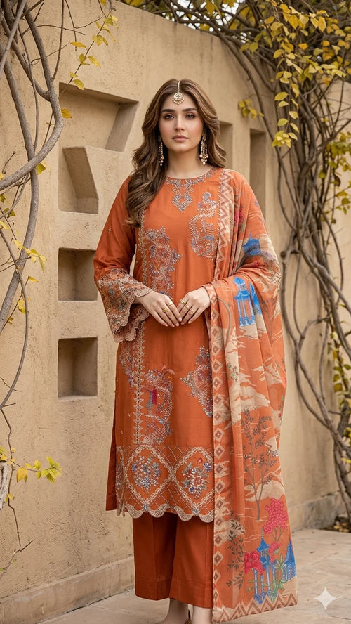 Burnt orange 3Pc - Embroidered Lawn Dress